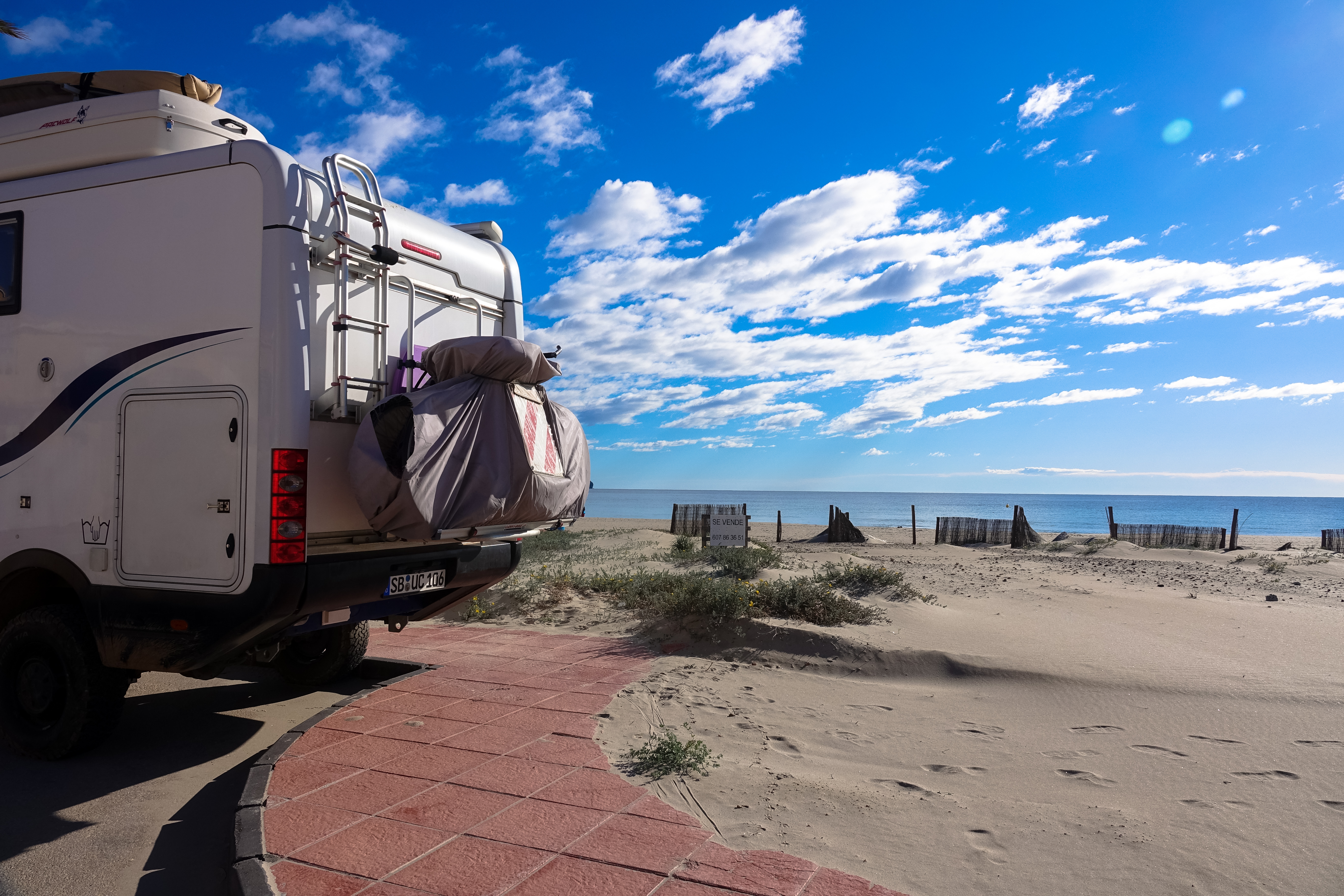 Also, wir können nur davon abraten mit dem Surfen oder Kiten anzufangen. Es macht so abhängig. Gut, wenn Wind ist, hat man jede Menge Spaß, aber genau deshalb wartet man immer auf Wind und richtet seinen ganzen Tagesplan nach den Prognosen von Windfinder und Windguru aus. Nein, das ist natürlich nur Spaß. Oder vielleicht ist ein Körnchen Wahrheit dabei. Wenn guter Wind ist, würden wir niemals etwas anderes machen, als aufs Wasser gehen. Selbst, wenn es kalt und regnerisch ist. Heute war natürlich Mal wieder alles anders als prognostiziert! Morgens war es richtig heiß und dazu kam noch, dass wir unseren Strandstellplatz vor dem Frühstück räumen mussten, weil alles für die Semana Santa aufgehübscht wird. Der Sand wird gesiebt und Straßen und Gehwege wurden gefegt und wir standen der Kehrmaschine im Weg. Wir haben also 3 Mal umgeparkt und anschließend haben wir gelesen und auf Wind gewartet.