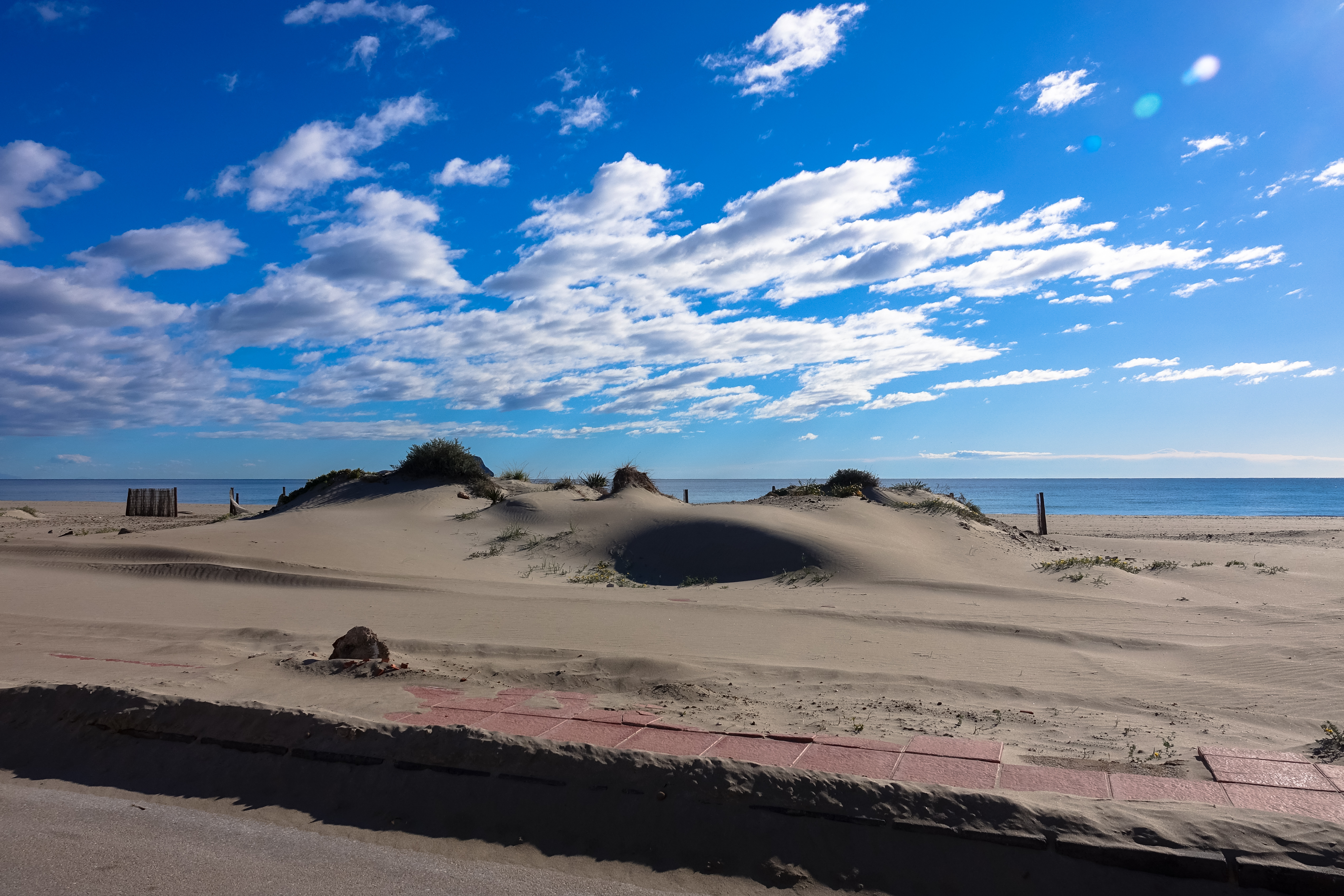 Zum Übernachten fahren wir dann an den Windmühlenstrand und entdecken, dass es eine Stelle am Mar Menor an der Sporthalle gegeben hätte, wo der Wind lokal verstärkt wird und es für große Segel gereicht hätte. Das müssen wir uns merken, wenn die Windapps noch einmal so daneben liegen.