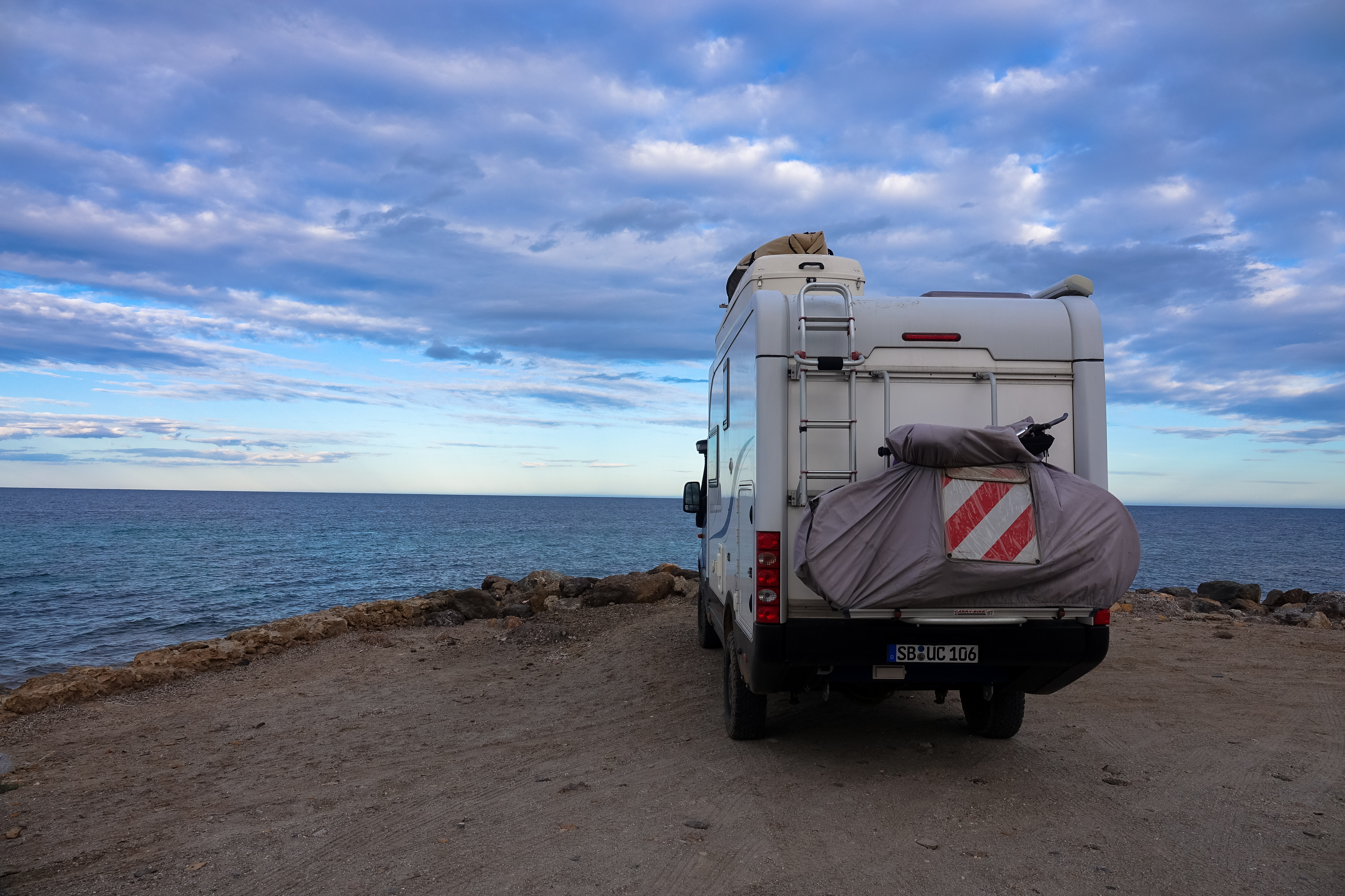 Dann liest Carmen am Strand und Uwe plant eine Veränderung an unserer Stromversorgung. Die Solarpanels sollen jetzt doch aufs Dach, genauer auf die Dachbox und für die kleinen Segel will Uwe eine Box für das Heck unserer Elsa kaufen.